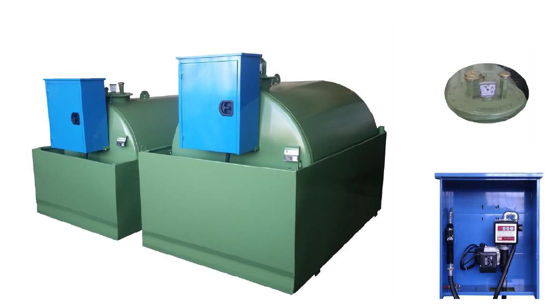 Pokrovom Ø 400 mm. Ventil za omejevanje obremenitve pri 90% zasedene prostornine rezervoarja. Zračenje rezervoarja s 1 "1/2 ventilom z mrežo (sistem, ki varuje proti vžigu). Indikator nivoja viden iz zunanje strani (plovec). Spodnji odtok za vsako periodično čiščenje. Zunanja sesalna cev omogoča primerno pretakanje dizelskega goriva; sesalni sistem je opremljen z nepovratnim ventilom, filtrom in krogličnim ventilom. V kompletu tudi kovinska omarica s ključavnico. Sesalna črpalka z lopatico, zmogljivost 50 l / min, vgrajen by-pass in linijski filter, priključen na 230 V enofazni elektromotor. Opremljeno s števcem, 4 m gumi cev skupaj z avtomatsko pištolo.