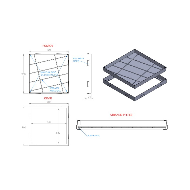 DIMENZIJE: zunanje 900 x 900mm / višina 62mm / odprtina okvirja 840 x 840mm