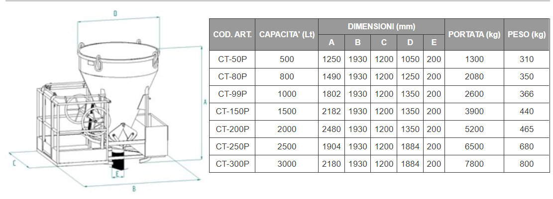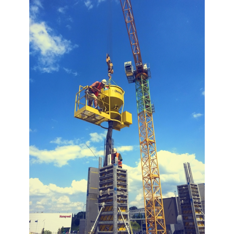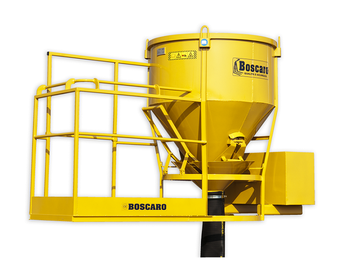 Zelo robustna posoda za beton s platformo za upravljavca. Platforma je opremljena z ograjami in sidrnimi kljukami. Model ponuja 4 dvižne kljuke, ki zagotavljajo večjo stabilnost in protiutež za uravnoteženje teže upravljavca. Z ročico za kontroliranje izpusta in gumijasto cevjo standardne dolžine 2 metra / premer 200 mm (dolžina po meri).