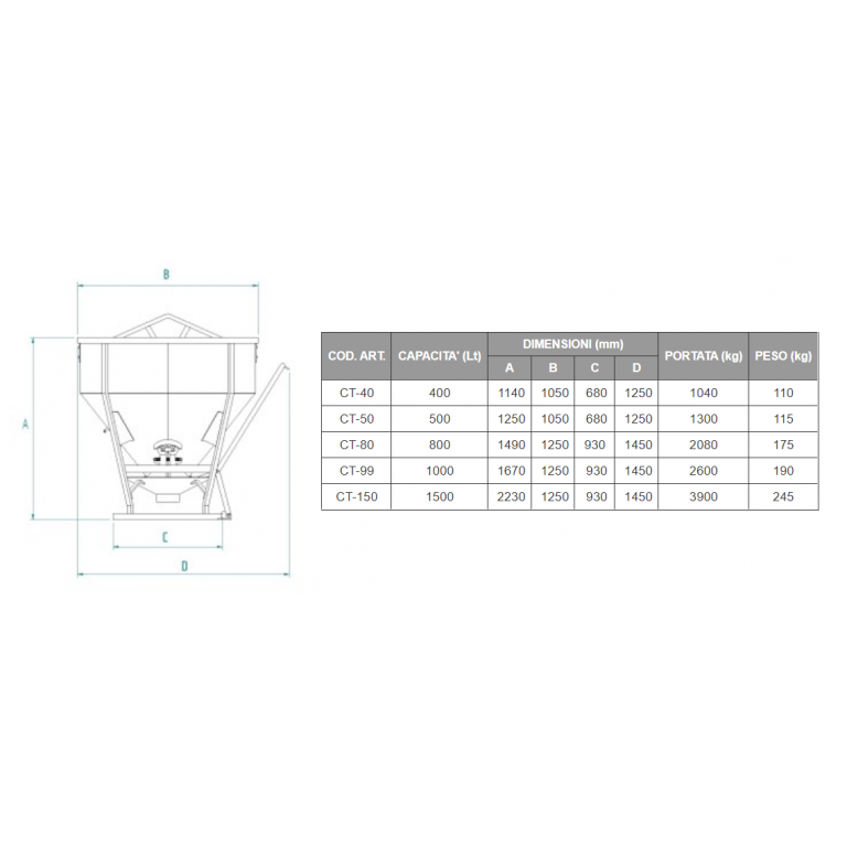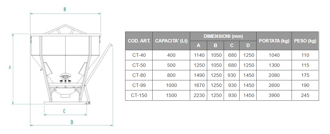 Model CT ima centralni izpust z gumijasto cevjo. Posodo odpiramo z vrvjo, zapira se avtomatsko (vzmet). Cev ima standardno dolžino 2 metra, Ø 200 mm (na zahtevo daljša dolžina).