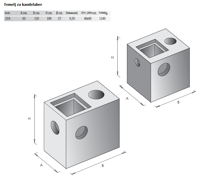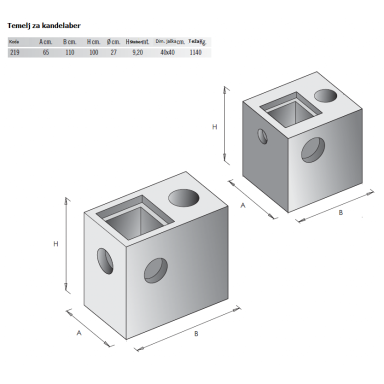 65 X 110 X 100 , Odprtina za jašek 40x40, Φ 27 cm. Teža: 1140 Kg